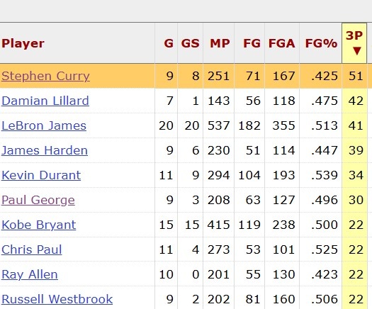 ⭐库里全明星生涯共命中51记三分 NBA历史第一&老詹排名第三
