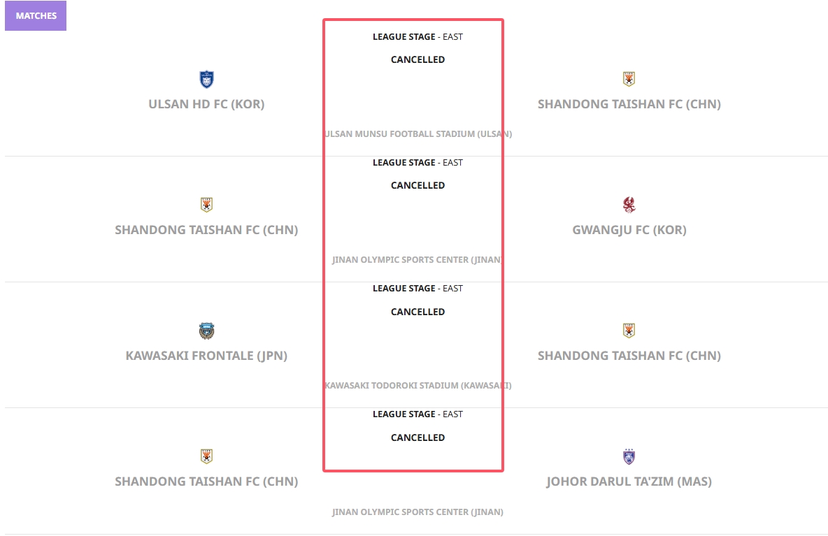 亚足联官网显示:山东泰山8场亚冠全部“取消”!积分榜数据清零