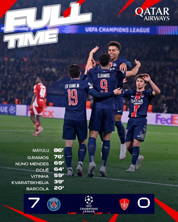 - 打进1球!官方:维蒂尼亚当选巴黎7-0布雷斯特全场最佳球员